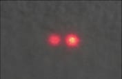 광축 조정 시 임시 측정 대상 물체로 얇은 백색 수지판이나 종이를 측정합니다. 이러한 대상 물체를 측정하면 레이저 스폿이 비쳐 보입니다. 위아래 스폿이 대상 물체를 상하로 이동시켜도 항상 1점에 겹치도록 센서 헤드를 설치합니다.