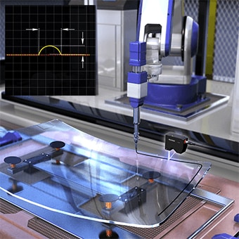 디스펜서 로봇으로 글라스에 우레탄 폼을 자동 도포하는 경우, 「LJ-V7000 시리즈」를 도입하면 도포 직후 장비에 추종하는 전체 검사가 가능합니다. 미세한 피치의 초고속 샘플링으로 도포 직후의 단면 형상을 검사하여 도포 불량을 모니터합니다.