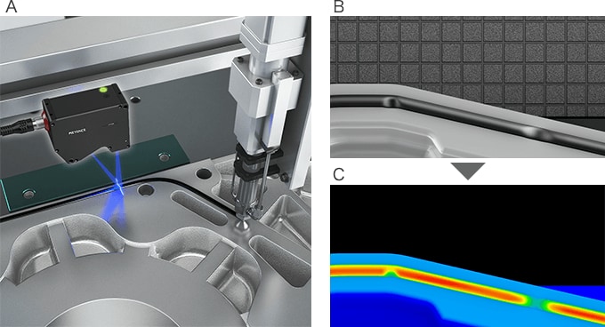 초고속 인라인 프로파일 측정기 「LJ-V7000 시리즈」는 디스펜서 로봇의 빠른 움직임을 추종하면서 도포 직후 연속적인 비드 형상이 된 실란트의 단면 형상을 실시간으로 측정할 수 있습니다. 대상 물체나 도포재의 색·형상·재질·금속의 반사광 등으로부터 영향을 받지 않기 때문에 도포한 재료의 높이 편차나 결함, 함몰 등 도포 불량을 안정적으로 검사할 수 있습니다.