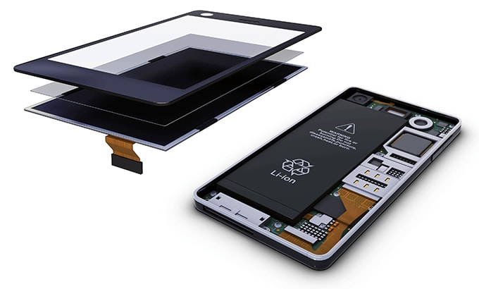 - 제품 조립: 커버 글라스, 터치 패널, 광학 필름, 액정 패널, 케이스 내장 부품의 조립: 각종 모듈, FPC(플렉시블 기판), 리튬 이온 2차 전지(LiB) 등