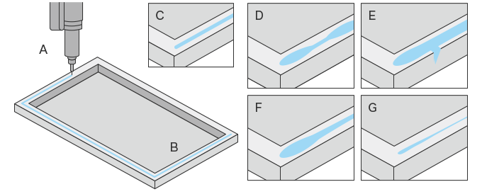 이러한 디바이스의 조립이나 부품 접합에서는 도포의 정도가 제품 품질이나 성능으로 직결됩니다. 특히 방수를 목적으로 실란트를 연속적인 비드 형상으로 도포하는 공정에서는 「맥동」이나 「도포량 과다」 「액체 고임」 「도포량 부족」과 같은 도포 형상의 결함이 제품의 품질 및 성능에 큰 영향을 미칩니다. 그러나 고화·밀봉 후에는 도포 검사가 어렵습니다.