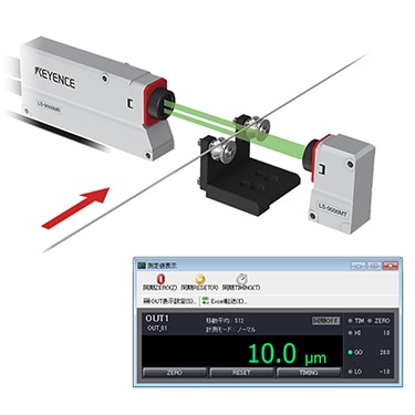 ø10 μm인 극세선 와이어를 안정적으로 측정하는 「극세 모드」를 탑재. 기존 모델과 비교하여 더 얇은 외경과 갭을 측정할 수 있습니다. 또한, LS-9000 시리즈는 투수광부 분리 타입이므로, 선재가 여러 개 나열된 공정에서는 1대의 측정부를 트래버스하면서 여러 개의 외경을 측정할 수 있습니다.