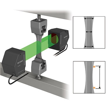 재료의 인장 시험편의 폭을 측정합니다. 투영된 실루엣을 측정하므로 임의의 장소의 폭을 최대 16포인트까지 측정할 수 있습니다. 수치 데이터의 아날로그 출력도 가능합니다.