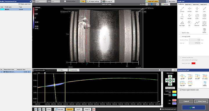 스캔하여 취득한 3D 형상 데이터에 PC 화면상의 다양한 보조 툴을 사용함으로써 임의의 위치에 올바르게 수직인 프로파일 선을 그릴 수 있기 때문에 측정 결과에 편차가 생기지 않습니다.