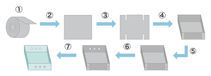 위에서도 설명했듯이 메탈 시트(판금) 가공에서는 '절단 가공/펀칭 가공', '굽힘 가공', '용접' 등의 공정을 거쳐 제품이 완성됩니다. 여기에서는 각각의 가공에 대해 설명합니다.