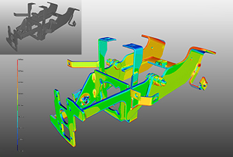 기존 검사 방법에서는 캘리퍼스나 다이얼 게이지 등으로 측정했지만 부분적으로만 측정할 수 있어 제품 전체의 용접에 의한 변형량 등의 측정이 어려웠습니다. KEYENCE의 3D 스캐너형 측정기 'VL 시리즈'를 사용하면 대상 물체 전체를 스캔하고 3D-CAD 데이터와 비교하여 용접에 의한 변형을 정량적으로 평가할 수 있습니다.