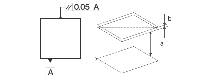그림의 지시에 따르면 그림에서 지시선의 화살표가 가리키는 면은 데이텀 평면 A(실제 대상 물체에는 굴곡이 있었다고 해도 임시로 평면이라고 가정한 면)에 평행해야 하며, 동시에 지시선의 화살표 방향으로 0.05mm만큼 떨어진 두 평면 사이에 있어야 합니다.