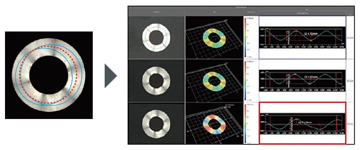 - 면으로 포착하기 때문에 대상 물체 전체에서 굴곡이 있는 부분을 파악할 수 있으며, 임의의 부분을 프로파일 측정할 수 있습니다..