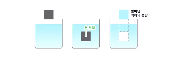 아르키메데스의 원리를 이용한 부피 측정 방법은 '유체(액체·기체) 속에 있는 물체는 그 물체가 차지한 액체나 기체의 부피만큼의 부력을 받는다'는 물리 법칙을 이용한 것입니다. 아르키메데스의 원리는 부력이 발생하는 원리를 나타낸 법칙이지만, 가라앉은 물체와 밀려난 유체의 양이 동일해지기 때문에 그 법칙을 이용하여 부피를 측정합니다.