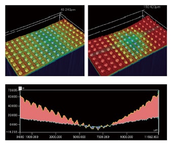 대상 물체 전체의 높이를 색으로 구분하여 표시하거나, 임의로 지정한 부분에 대한 프로파일 측정도 가능하기 때문에 형상 불량 부분과 그 상세한 수치 등을 가시화하여 파악할 수 있습니다. 이에 따라 금형이나 성형 조건 등 불량 원인의 특정 및 조정도 원활하게 실시할 수 있습니다.