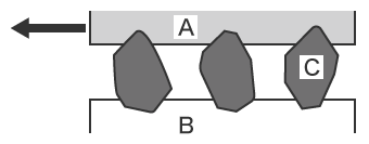 - 연마 마모에는 「이원 마모」와 「삼원 마모」가 있습니다. 이원 마모는 부드러운 쪽의 부재에 딱딱한 쪽의 부재가 박혀 발생하는 마모입니다. 또한 삼원 마모는 경질의 마모분(경질 입자) 등에 의해 금형 표면이 기계적으로 깎이는 현상으로 「긁힘 마모」라고도 불립니다.