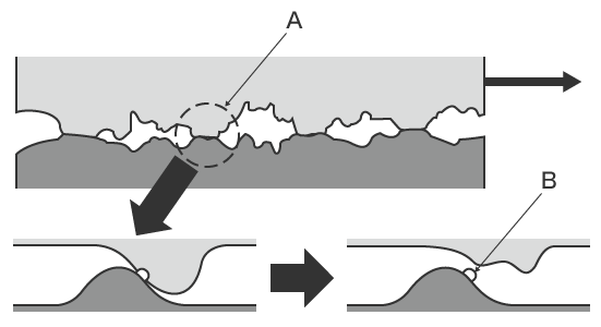 - 부재의 돌기 사이의 접촉부가 응착을 일으켜 응착부가 박리되어 마모되는 현상입니다. 「눌어 붙음」이라고도 합니다.