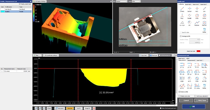 또한 일단 워크를 스캔하면 과거의 측정시와는 다른 부분의 프로파일(단면 형상)을 측정하는 것도 가능합니다. 일부러 동일 개체를 다시 준비하여 재측정할 필요는 없습니다.