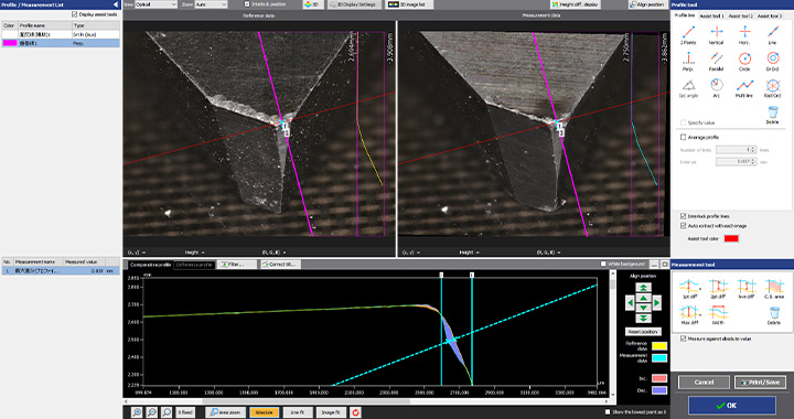광범위한 형상을 「면」으로 측정하여 80만 포인트의 점 데이터를 수집. 선이나 점에 의한 측정이 아니므로 재검토가 필요하지 않아 측정 시간을 단축할 수 있습니다. 마모량 등 정의하기 어려운 항목도 체적이나 표면적으로 평가할 수 있어 평면도의 정량적인 평가도 쉽게 할 수 있습니다. 또한 임의로 지정한 부분에 대해 프로파일 측정을 할 수 있습니다. 측정 후에도 대상 물체를 다시 설정하지 않고 3D 스캔한 데이터에서 다른 부분의 프로파일 데이터를 취득할 수도 있습니다.