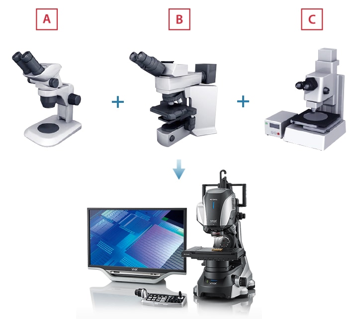 실체 현미경, 금속 현미경, 측정 현미경의 기능을 모두 제공합니다.