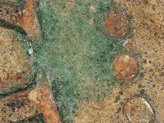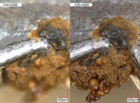 - (1)현미경을 사용하여 부식부 표면을 상세하게 관찰하고 부식부·부식물의 상태를 확인합니다. 또한, 부식부를 세정하여 기재 표면의 공식 등을 확인하는 경우도 있습니다.