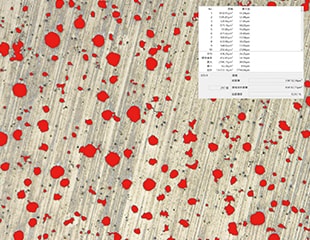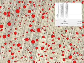 또한 자동 면적 계측·카운트 기능은 지정한 조건에서 구상화한 흑연을 판별하여 개수와 면적 외에 총면적, 총면적율, 나아가 흑연의 최대 직경과 그 평균, 표준 편차, 최대값, 최소값 등 다양한 데이터를 자동으로 신속하게 취득할 수 있습니다.