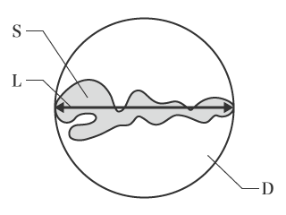 흑연의 구상화를 평가하기 위해 사용하는 「진원도 계수(R)」는 그림과 같이 재료 안에서 관찰되는 흑연의 최대 직경(장축)을 L, 면적을 S, 최대 직경을 직경으로 삼는 원을 D로 하여 S의 면적을 D의 면적으로 나누어 구합니다.