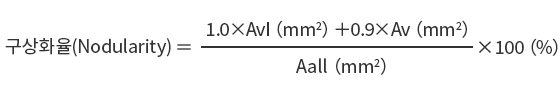 - 흑연 구상화율 계산은 10 μm 이상의 사이즈이며 진원도 계수에서 「V」와 「VI」으로 분류된 흑연의 면적을 사이즈가 10 μm 이상인 흑연의 총면적으로 나눈 값입니다.