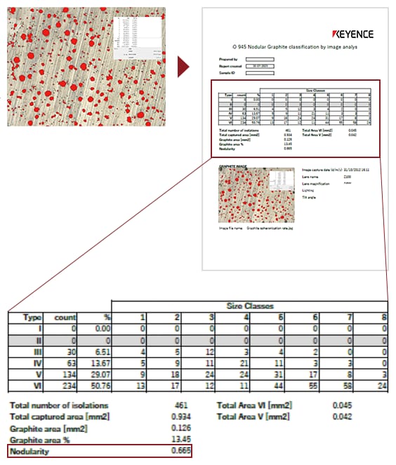 4K 디지털 마이크로스코프 「VHX 시리즈」는 구상화한 흑연을 고정도로 자동 계측할 수 있을 뿐만 아니라 취득한 화상 데이터와 수치 데이터를 사용한 리포트를 자동으로 작성할 수도 있습니다.