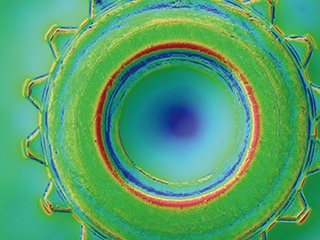 Optical Shadow Effect Mode 화상에 대상 물체의 컬러 정보를 합성해 요철 정보와 컬러 정보를 동시에 표현할 수 있습니다. 또한, 아래 화상과 같이 요철 정보를 색으로 구분하여 표시한 「컬러 맵 화상」을 통해 작은 너트의 굴곡과 같은 미세한 요철 정보도 알기 쉽게 가시화할 수 있습니다.