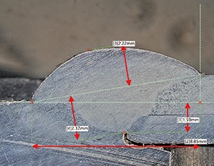 용접부 단면의 치수 측정은 강도와 품질에 관한 중요한 검사입니다. 그러나 기존의 실체 현미경은 모재와 비드의 콘트라스트가 낮아 측정 부분의 판단이 어려웠습니다. 또한, 육안으로 메모리와 대조하여 그 수치를 수동 입력해야 했기 때문에 사용자에 따른 오차 및 작업 번잡화가 과제였습니다.