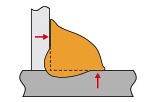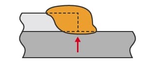 용융 금속에 대한 입열 부족 등으로 인해 필요한 용입 깊이보다 용입량이 부족해지는 불량입니다. 그림은 겹치기 필렛 용접의 예시입니다. 맞대기 용접의 경우, 모서리 하부에서 발생하기 쉬우며, 박판의 T(수평 필렛) 조인트의 경우, 일반적으로 용입 깊이가 박판 측의 20%일 때 용입 부족이라고 합니다.