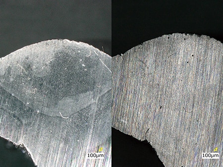 4K 디지털 마이크로스코프 「VHX 시리즈」는 고해상도의 4K 화상으로 에지를 선명하게 포착할 수 있습니다. 용접 금속과 모재의 경계를 구별하기 어려운 겹치기 필렛 용접의 단면에서도 경계의 선명한 에지와 금속 조직의 차이, 불량 부분을 바로 구별해서 볼 수 있게 되었습니다.