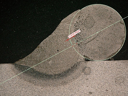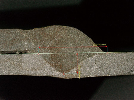 따라서 용접 후의 용접 비드 단면 크기인 「목 두께(목 단면)」나 「각장」, 「용입 깊이」 등을 측정하여 강도 설계에 따른 용접 품질을 검사하는 것이 중요합니다. 용접부의 품질은 용접 후 단면의 매크로 측정을 통해 평가할 수 있습니다.