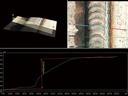 용접 비드는 연속적인 요철 형상입니다. 비드 표면에 덧살 부족·오버랩·언더 컷·피트·균열 등의 불량(비연속성)이 있는 경우 목적으로 하는 기계적 특성을 얻지 못하여 파손의 원인이 되기도 합니다. 그러나 기존의 현미경은 비드 요철의 일부에만 초점이 맞아 덧살 등의 평가에 필요한 높이 정보를 취득하지 못했습니다.