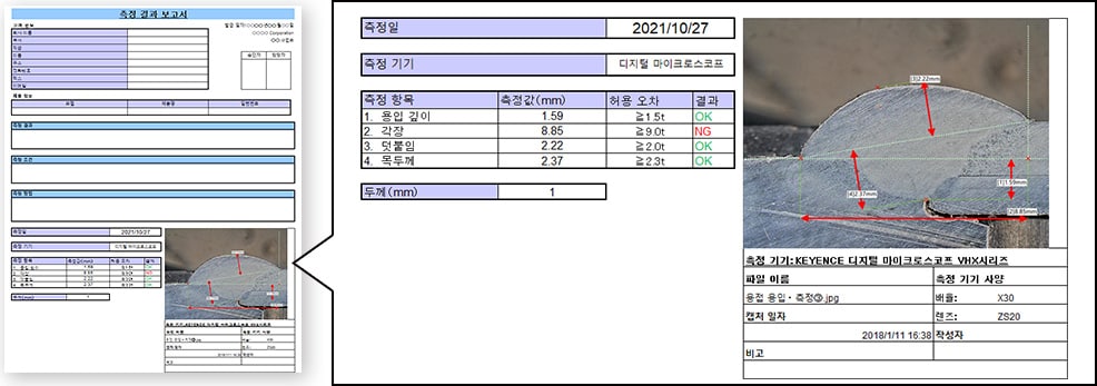 화상과 각 치수·OK/NG 판정 등을 즉시 리포트로 작성하여 작업 부담을 크게 절감.
