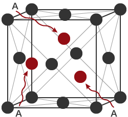 담금질을 실시하면 철은 정육면체의 각 모서리와 면의 중심에 원자가 위치하는 「면심 입방 격자」라는 형태가 되고 그곳으로 탄소가 용입됩니다.