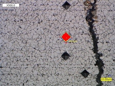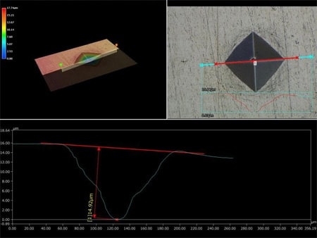남겨진 비커즈 자국의 대각선 길이를 측정하여 산출할 수 있습니다.