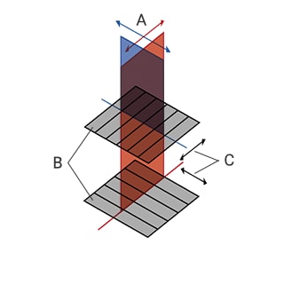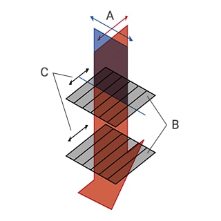 직교 니콜이라고도 불립니다. 상호 편광하는 방향이 직교하는 2개의 니콜 사이에 프레파라트 샘플을 넣고 관찰하는 것을 말합니다. 오른쪽 그림과 같이 2개의 니콜에 수직 및 평행 방향으로 진동하는 빛은 투과되지 않습니다. 또한 이 2개의 니콜을 겹치면 암흑이 생기지만, 진동하는 방향에 따라서는 니콜 사이에 둔 샘플의 빛이 크로스 니콜을 통과하여 관찰할 수 있습니다.