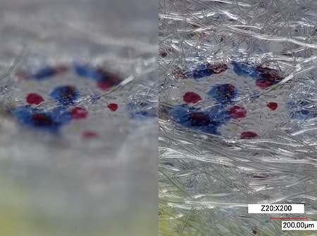 또한, 기존의 현미경은 입체적인 섬유 구조의 인쇄 용지를 고배율로 관찰할 때 피사계 심도의 한계로 인해 일부에만 초점이 맞았습니다.