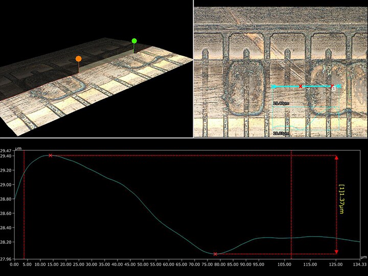 또한, 관찰 화상에서 그대로 3D 형상·프로파일 측정을 실행할 수 있기 때문에 수치에 따라 정확하게 평가할 수 있습니다.