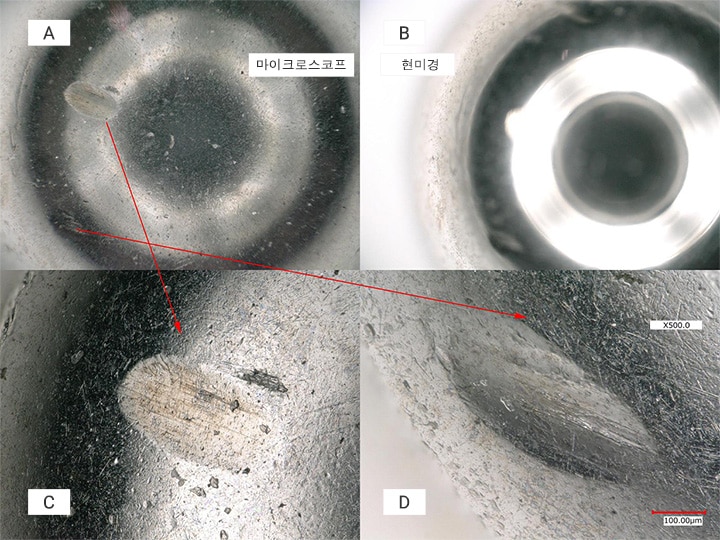 베어링이 어떤 타격을 입어 생긴 흠집을 관찰합니다. 관찰면이 평면이 아닌 경우, 현미경을 이용한 고배율 관찰은 높이가 아주 조금만 달라도 초점이 맞지 않아 초점을 섬세하게 조정하는 데 시간이 걸렸습니다.