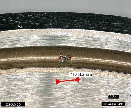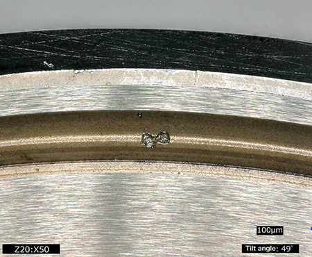 4K 디지털 마이크로스코프 「VHX 시리즈」는 「헐레이션 제거」·「링 제거」 기능으로 반사광을 제거합니다. 마찰로 광택이 강해진 슬라이딩면의 헐레이션을 억제하여 선명하게 촬영할 수 있습니다. 미세한 헤어라인 흠집 및 마찰 흠집과 부착물의 차이도 판별할 수 있기 때문에 마찰·마모의 상태를 더 정확하게 파악할 수 있습니다.