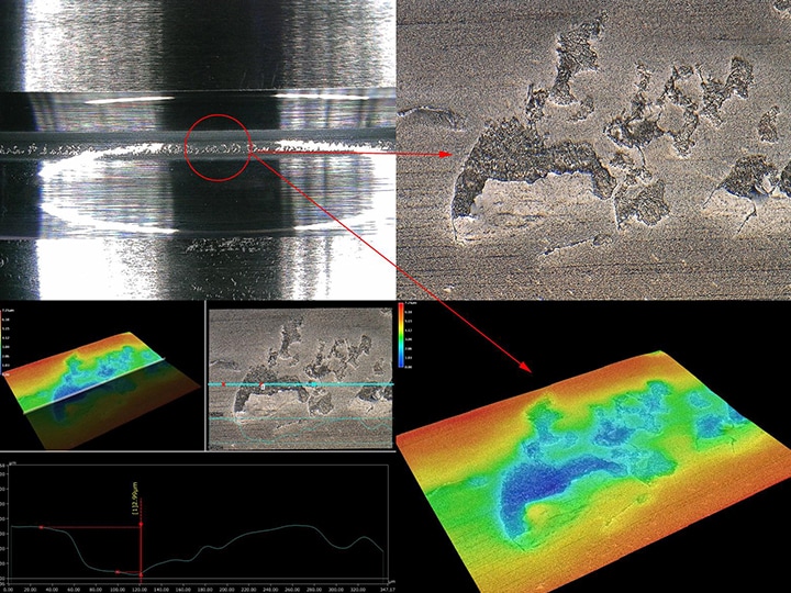 4K 디지털 마이크로스코프 「VHX 시리즈」는 선명한 확대·관찰 뿐만 아니라 기존의 현미경으로는 불가능했던 다양한 계측·측정과 수치 취득이 실현됩니다. 마우스를 이용한 간단한 조작으로 마모 시험 후의 슬라이딩면 플레이킹* 및 피칭* 등 손상 관찰부터 거칠기 검사에 도움이 되는 평면 계측·거칠기 측정까지 이 1대로 쉽게 이루어집니다.
