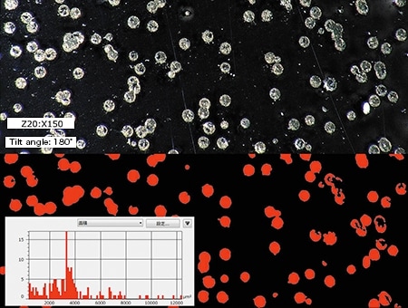 육안으로 결정을 카운트하는 경우, 정량적으로 평가할 수 없었습니다. 또한, 계측은 별도로 전용 계측기나 소프트웨어를 이용해야 했기 때문에 검사 공정과 공정 수의 증가가 과제였습니다.
