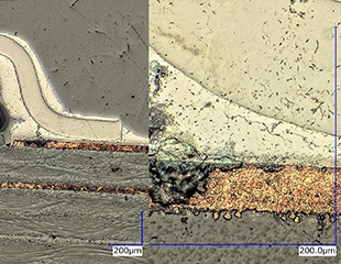 IC 단면의 땜납 크랙 관찰(왼쪽: 150× / 오른쪽: 1000×)