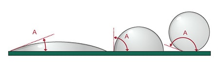 습윤성(젖음성)이란: 고체 표면과 그 표면에 적하된 액체(용융 상태의 땜납 등)와의 「접촉각 θ(Contact Angle)」의 크기로 습윤성을 나타낸다. 그림 내 A의 각도(접촉각θ)가 작을수록 습윤성이 높고 액체가 고체 표면에 잘 도포된 상태이다. 접촉각이 클수록 고체 표면이 액체를 튕겨 내며 습윤성이 낮다.
