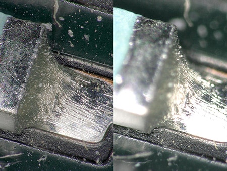 솔더 필렛의 경사 관찰 왼쪽: 심도 합성·헐레이션 제거·링 제거 / 오른쪽: 일반