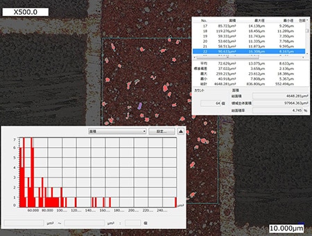 4K 디지털 마이크로스코프 「VHX 시리즈」는 고해상도의 확대 화상을 사용한 고정도의 자동 면적 계산·카운트를 실현합니다. 정량적으로 해석할 수 있는 동시에 촬영 화상 및 수치 데이터를 이용한 리포트 작성까지 1대로 신속하게 완결되어 작업 공정 수를 크게 절감할 수 있습니다.