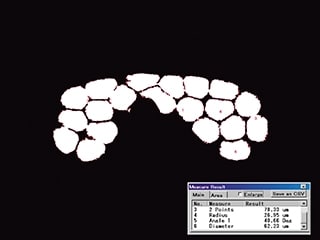 예를 들어, 아래의 화상과 같이 심선 코킹 단면의 심선부만 자동으로 면적을 계측할 수 있습니다. 따라서 크림프 하이트의 측정 및 단면 관찰만으로는 알아내지 못했던 코킹부 심선 상태까지 빠르게 정량적으로 검사할 수 있습니다.