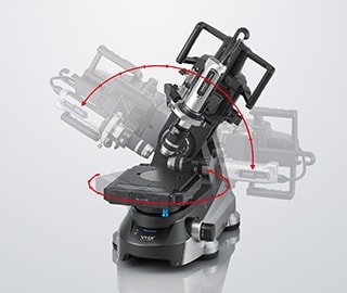 4K 디지털 마이크로스코프 「VHX 시리즈」는 「프리 앵글 관찰 시스템」과 「고정도 X·Y·Z 전동 스테이지」를 활용하여 시야·회전축·경사축의 3가지 축을 간단하게 맞추면서 경사 관찰을 실시할 수 있습니다. 렌즈 측을 기울이거나 회전시켜도 시야 범위에서 벗어나지 않습니다. 따라서 간단하고 원활하게 경사 관찰을 실시할 수 있습니다.