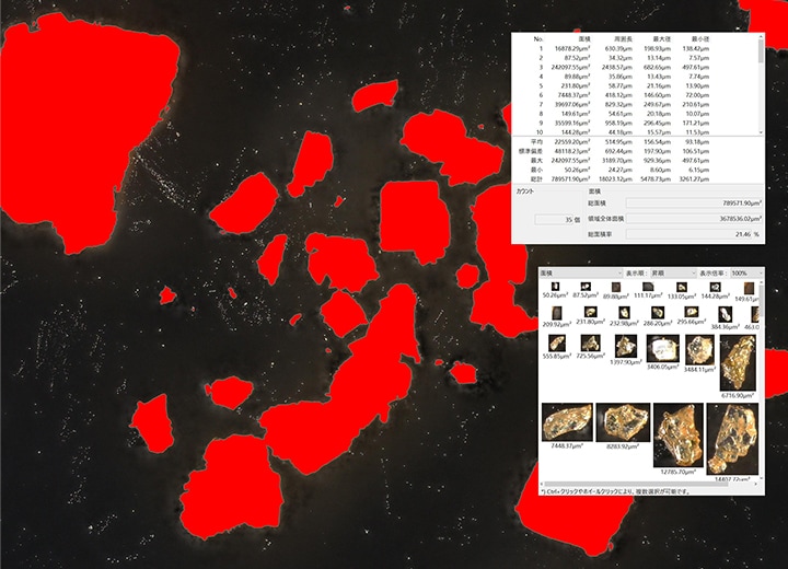 각 결정의 면적·둘레 길이·최대 직경·최소 직경 외에 선택 범위 내 결정의 개수와 면적의 평균·표준 편차·최대값·최소값·면적률 등 자세한 수치를 자동으로 계측·산출·카운트하여 목록으로 표시합니다. 선택 범위에 포함되는 불필요한 대상 물체의 제외 및 서로 겹치는 대상 물체를 분리할 수도 있어 고정도 분석이 실현됩니다.