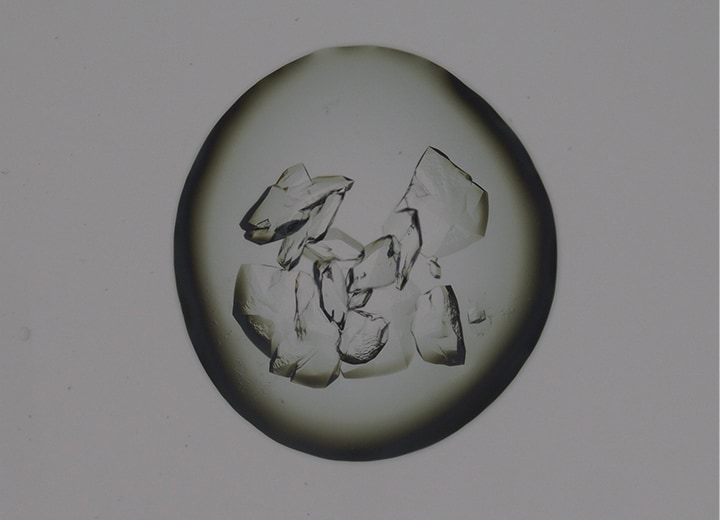 결정이란 물질의 고체 상태 중 하나로 원자 또는 분자, 이온 등이 규칙적인 주기로 반복하여 입체적으로 배열되고, 공간 격자를 만든 상태를 말합니다. 결정 내 원자 배열을 「결정 구조」라고 하며 배열의 규칙적인 주기의 최소 단위를 「단위 격자」라고 합니다. 원자 및 무기물 분자 외에 예를 들어 100만이 넘는 분자량을 지닌 단백질 분자 등도 결정이 됩니다.
