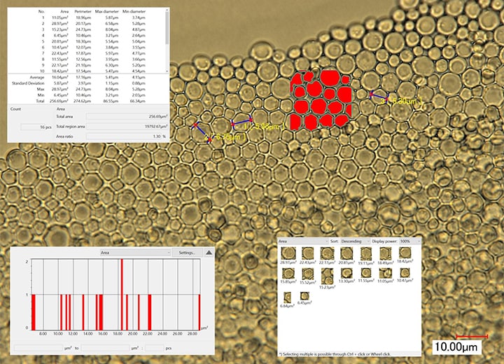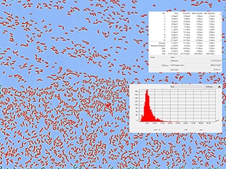 「자동 면적 계측·카운트」 기능은 범위를 지정하는 것만으로 박테리아의 정확한 카운트를 비롯해 면적·둘레 길이·최대 직경·최소 직경 외에 선택 범위 내 박테리아 면적의 평균·표준 편차·최대값·최소값·면적률 등 자세한 수치를 자동으로 계측·산출하여 목록으로 표시합니다.