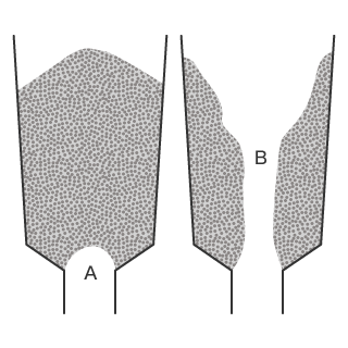밀가루 같은 유동성이 낮은 분체는 원추 모양으로 쌓아 올리면 형상이 유지되며, 아래쪽도 많이 퍼지지 않습니다. 유동성이 낮으면 호퍼나 사일로에서 잘 배출되지 않아 브릿지나 래트 홀이 생길 수 있습니다.